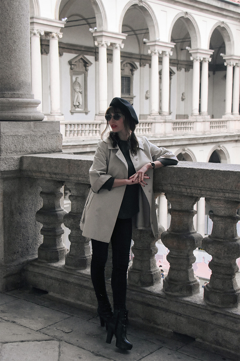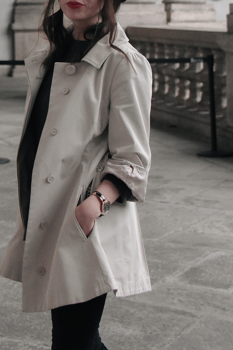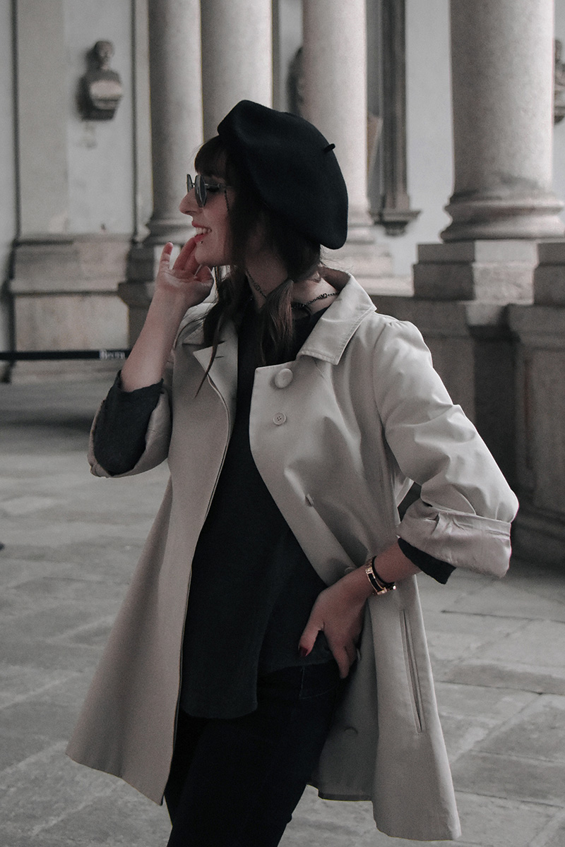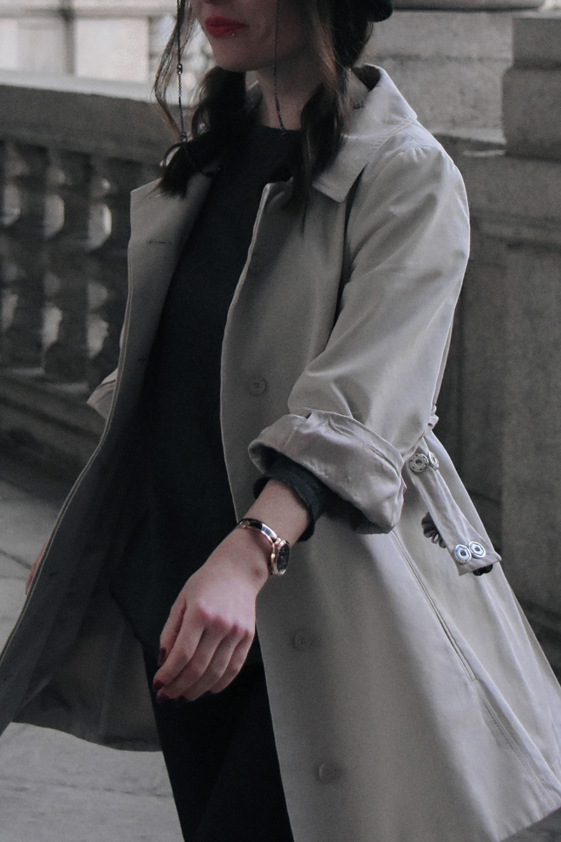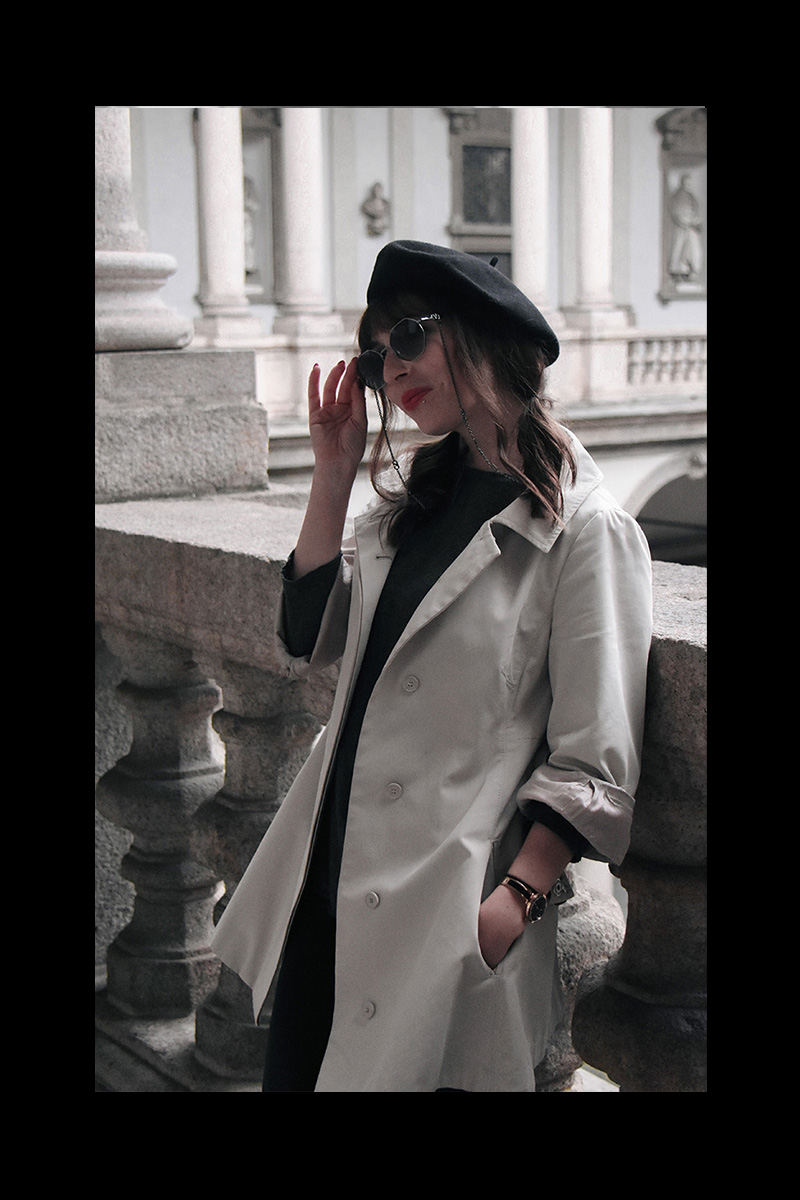 As for style, gloomy days are for monochromatic combinations. Shades of grey that litter the city get transferred on the look. Dark grey jeans and shirt are covered with my favourite beige trench coat. Parisian beret and red lipstick are worn as accents to make combination more playful by breaking the monotony. Especially when the coat is cutely tailored, once worn with beret, gets even more of french charm (which is ever-present in my looks).