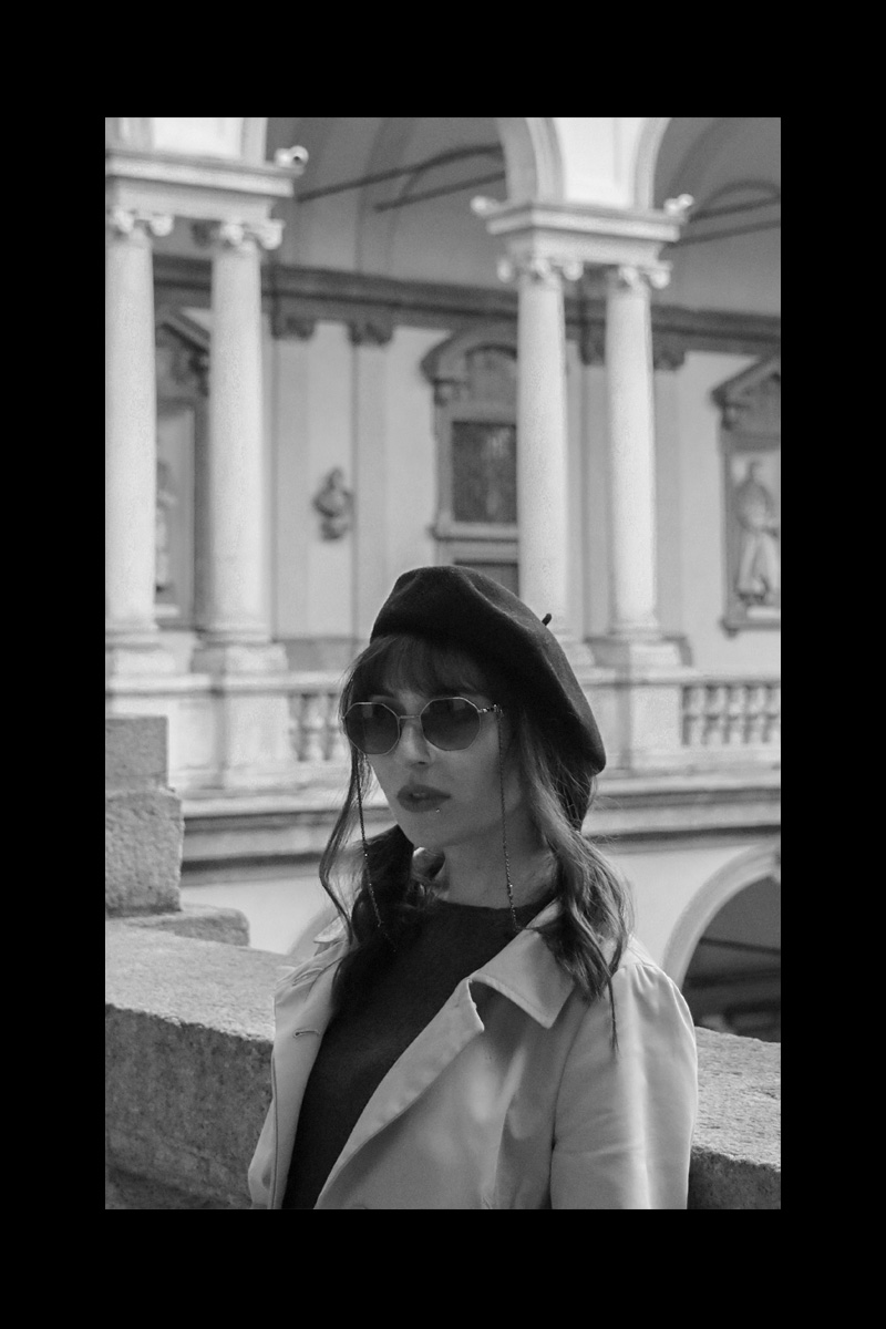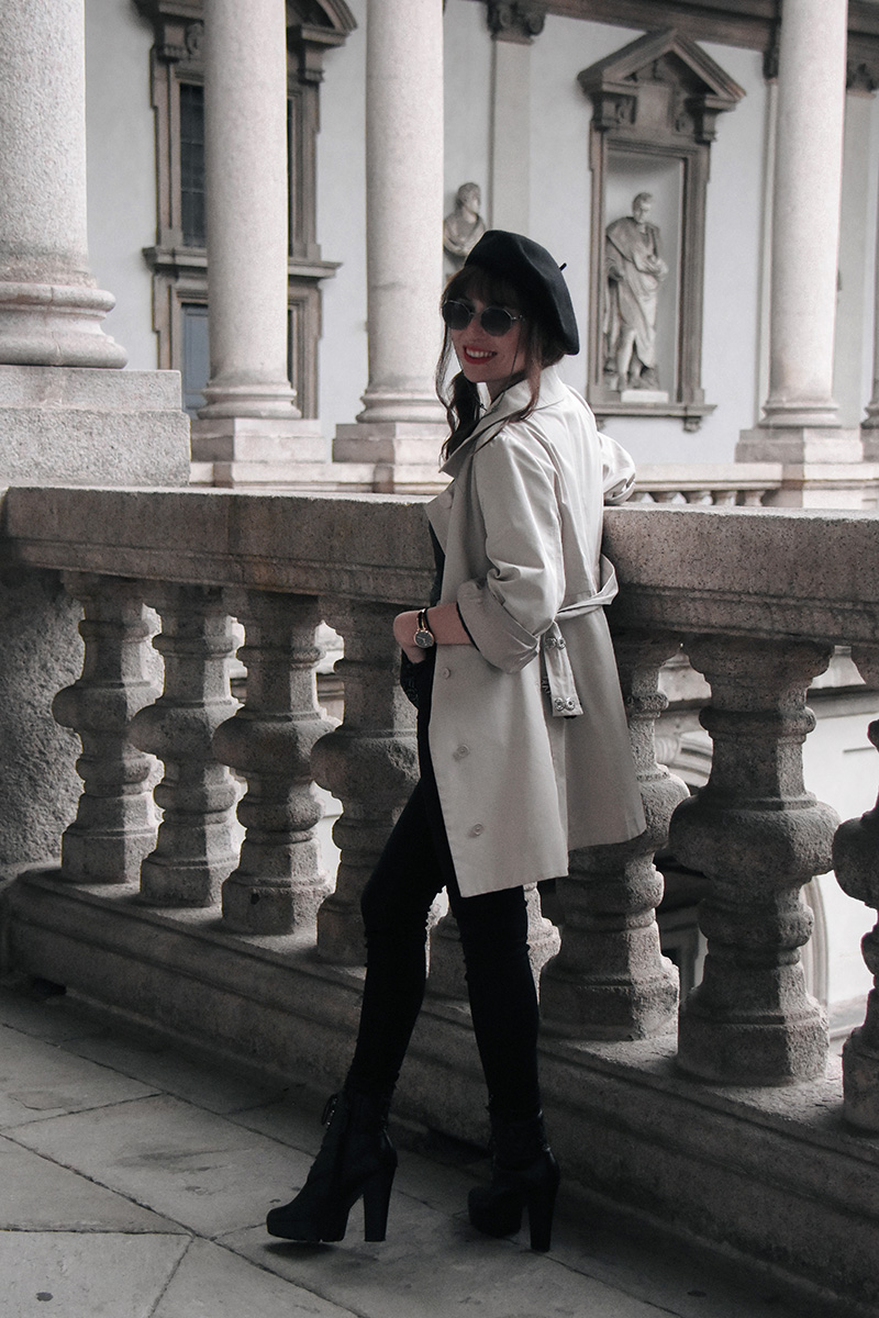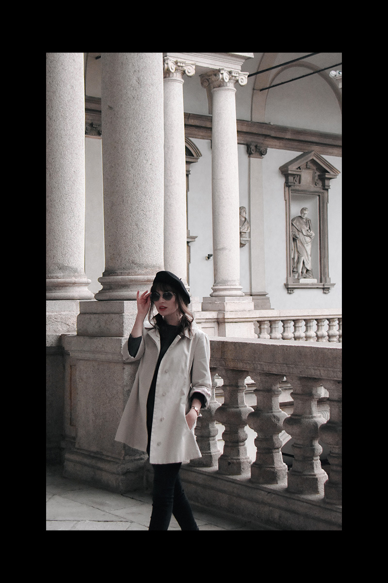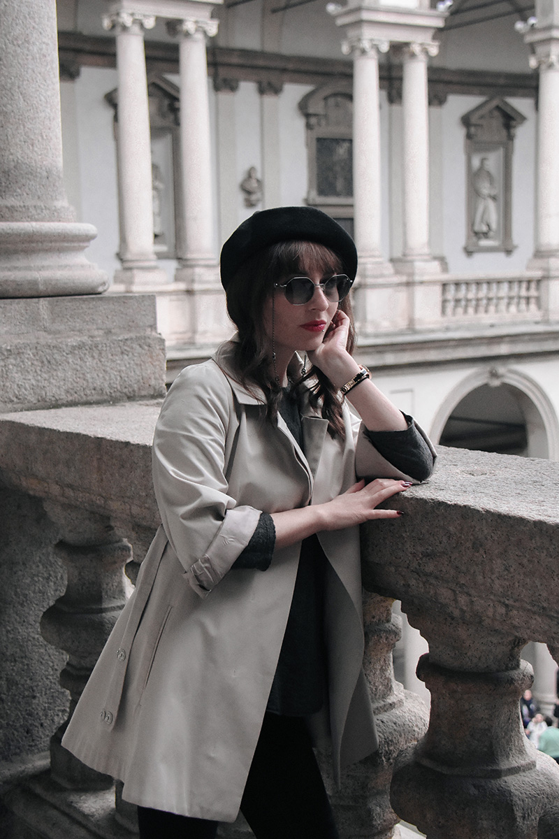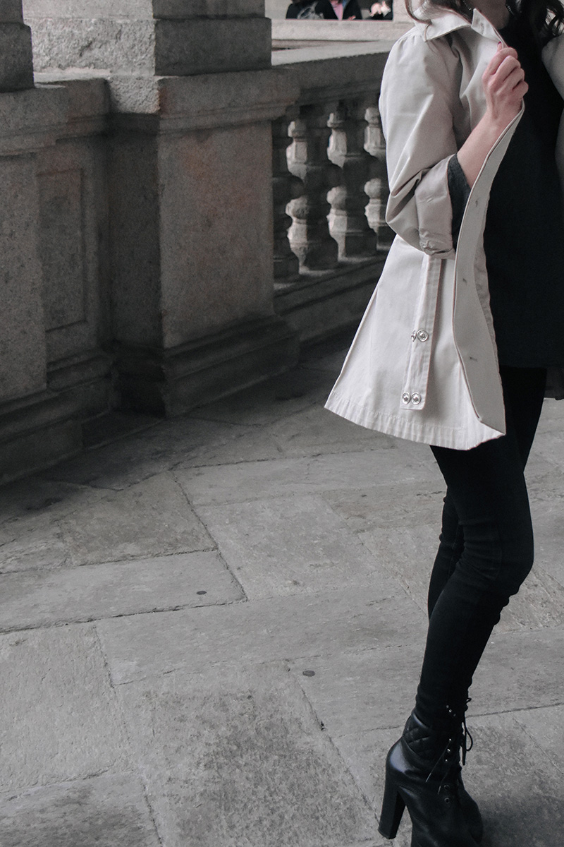 As for style, gloomy days are for monochromatic combinations. Shades of grey that litter the city get transferred on the look. Dark grey jeans and shirt are covered with my favourite beige trench coat. Parisian beret and red lipstick are worn as accents to make combination more playful by breaking the monotony. Especially when the coat is cutely tailored, once worn with beret, gets even more of french charm (which is ever-present in my looks).