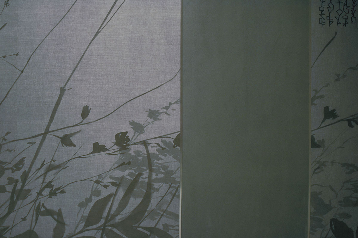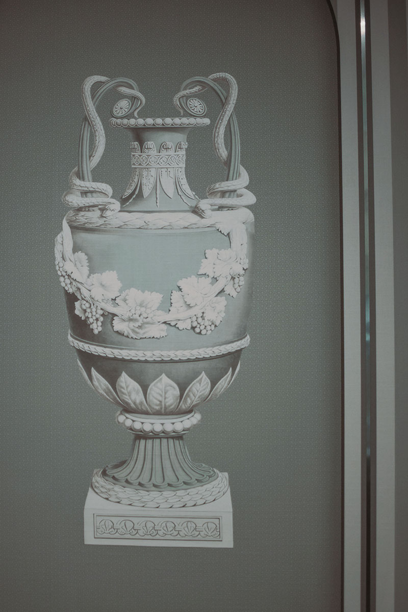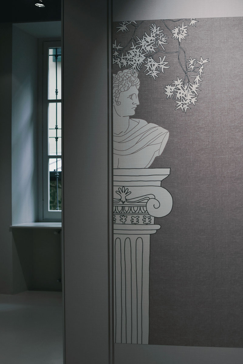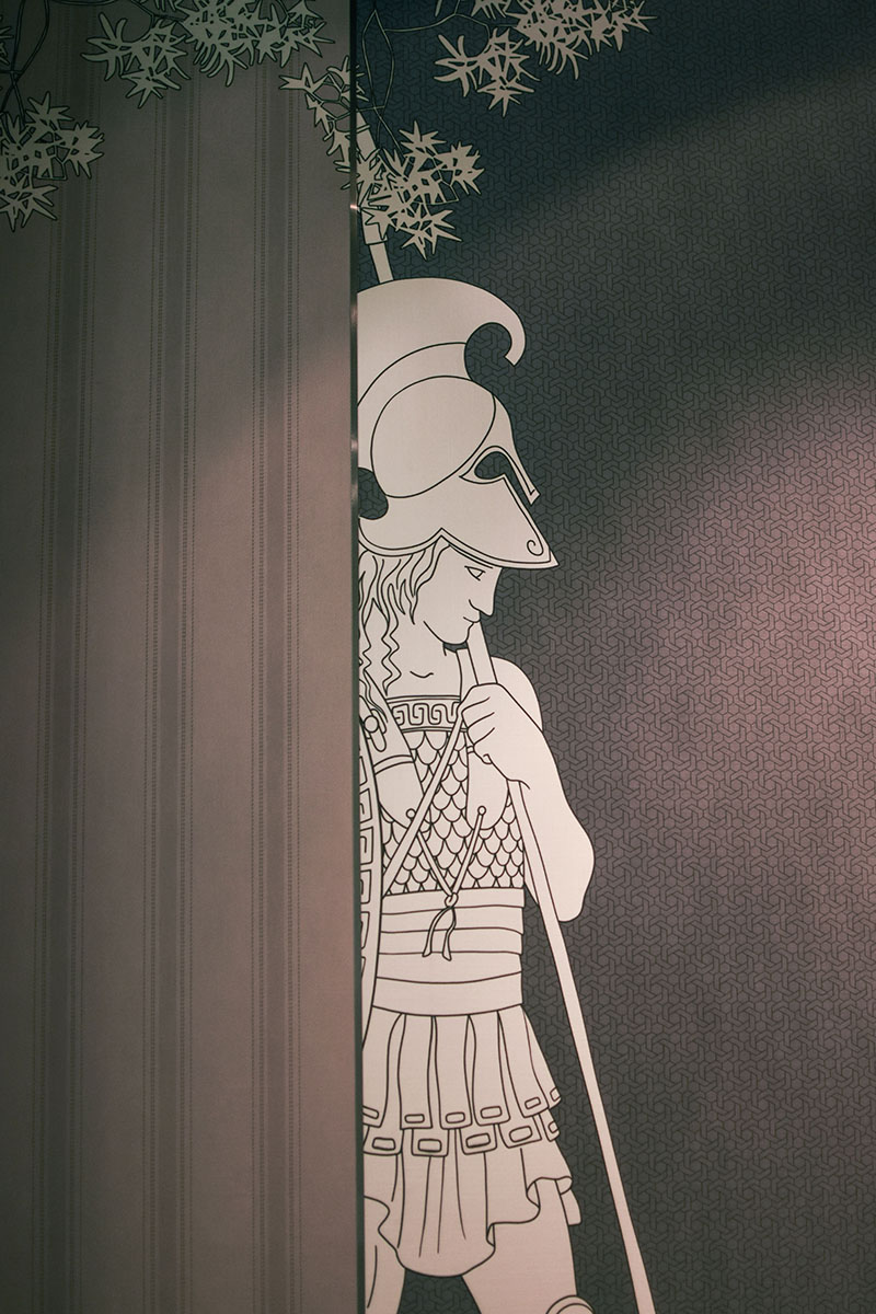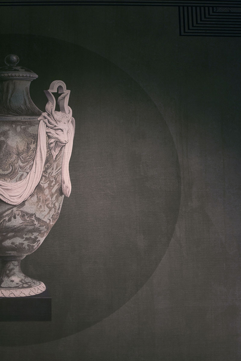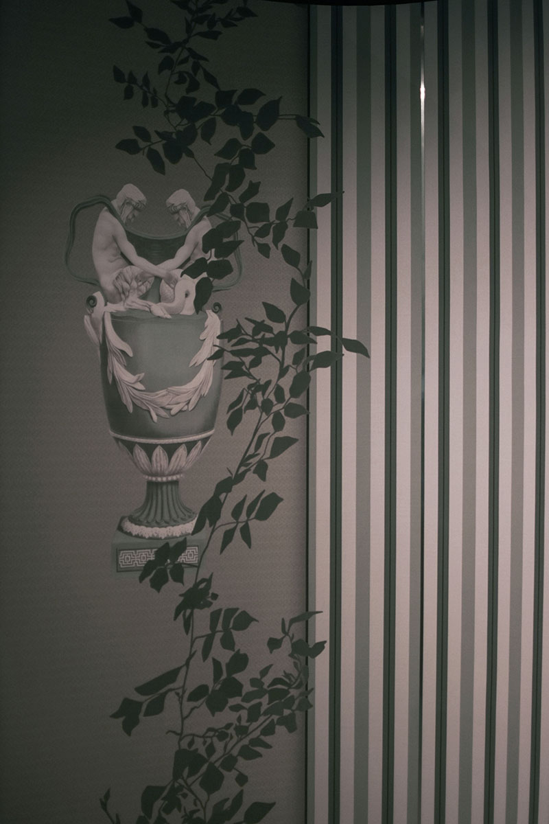 Gli elementi grafici hanno svolto un ruolo importante nel realizzare il quadro completo. Combinati con elementi oscuri, i motivi sono stati utilizzati per sviluppare la composizione e continuare il gioco per raggiungere l'armonia. Attraverso toni freddi, tanti dettagli che compongono un insieme stupendo, ho potuto immaginare il perfetto funzionamento della carta da parati nelle camere degli hotel in cui sono cresciuta e definire una scena da favola, che, per altro, doveva essere data solo dalla mia esperienza.