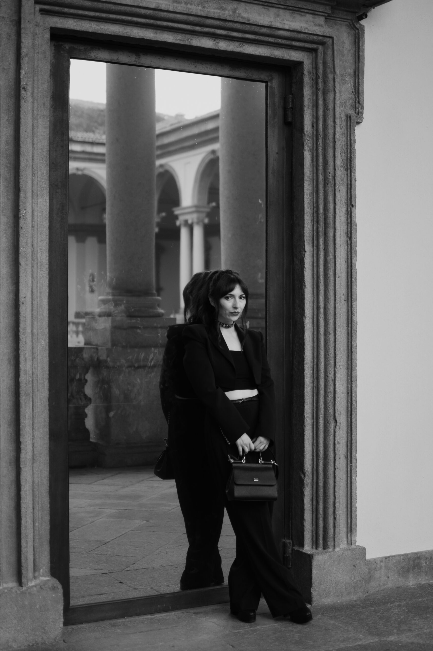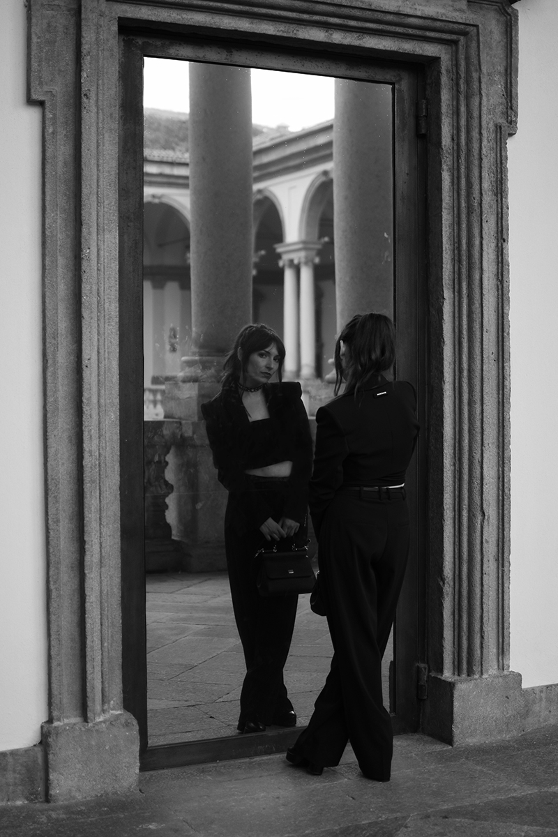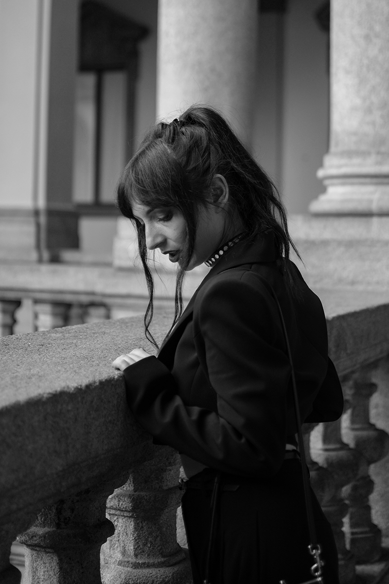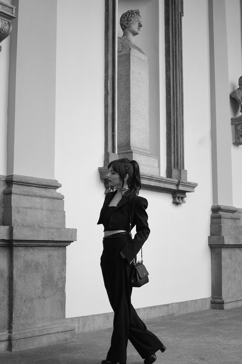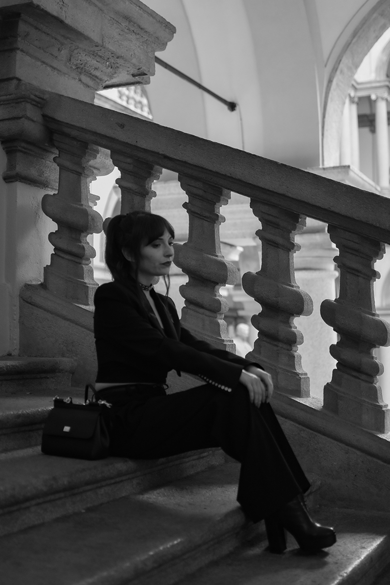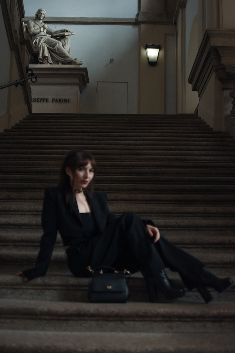 wearing: suit, choker, belt Patrizia Pepe boots Ralph Lauren Sicily handbag Dolce & Gabbana